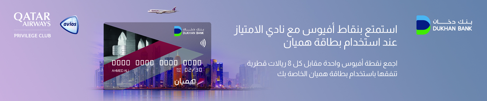أصبح الإنفاق باستخدام بطاقات هميان أكثر مكافأة. ستحصل على نقطة أفيوس واحدة مع نادي الامتياز التابع للخطوط الجوية القطرية مقابل كل 8 ريالات قطرية تنفقها باستخدام بطاقة هميان. بالإضافة إلى ذلك، ستستفيد أيضًا من عروض إضافة البطاقة إلى حساب عضويتك في نادي الامتياز، وستحصل على المزيد من نقاط أفيوس عن مشترياتك باستخدام بطاقة هميان المضافة إلى حساب عضويتك في منافذ البيع الشريكة.