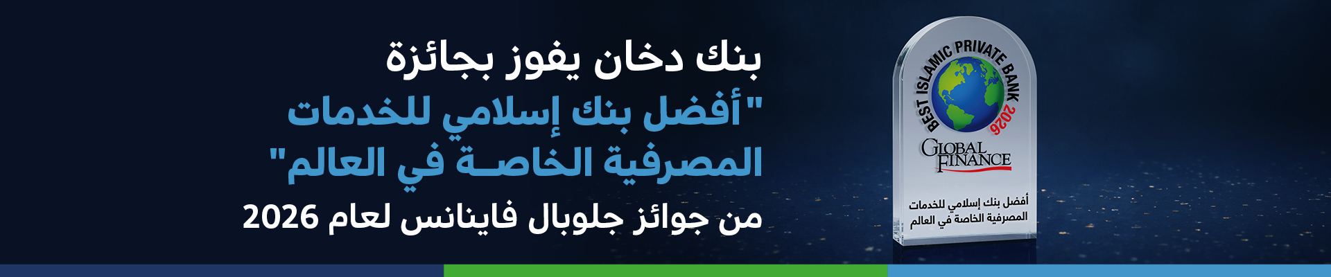 للعام الثالث على التوالي، فاز بنك دخان بجائزة "أفضل بنك إسلامي للخدمات المصرفية الخاصة في العالم لعام 2026" من مجلة جلوبال فاينانس، وذلك خلال حفل توزيع جوائزها السنوية لأفضل المؤسسات المالية الإسلامية في العالم.