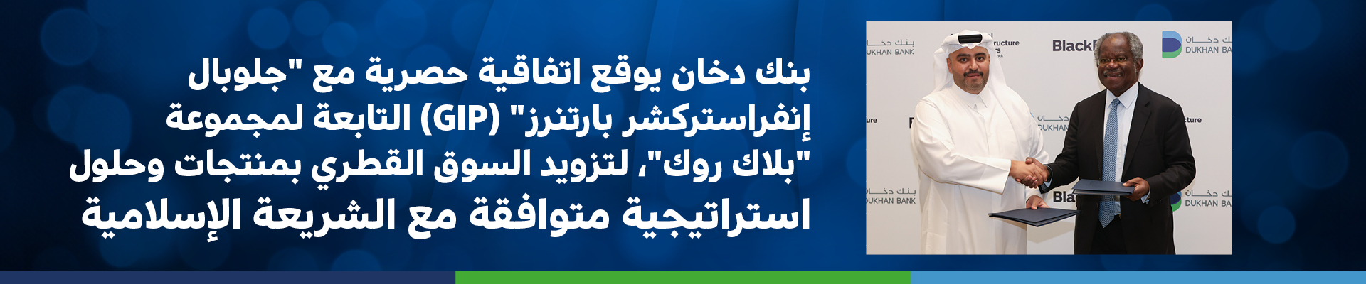 بنك دخان يوقع اتفاقية حصرية مع "جلوبال إنفراستركشر بارتنرز" (GIP) التابعة لمجموعة "بلاك روك"، لتزويد السوق القطري بمنتجات وحلول استراتيجية متوافقة مع الشريعة الإسلامية