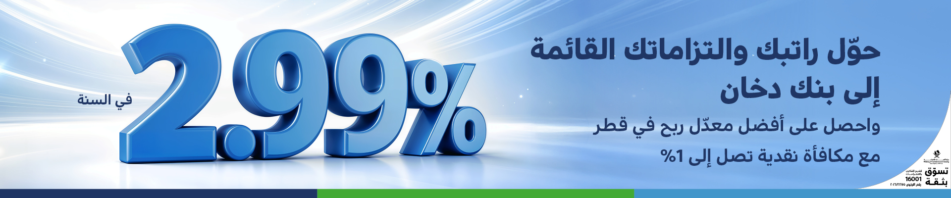 حوّل راتبك والتزاماتك القائمة إلى بنك دخان واحصل على أفضل معدّل ربح في قطر بنسبة 2.99% سنوياً ومكافأة نقدية تصل إلى 1%، مع التمويل الشخصي من بنك دخان.