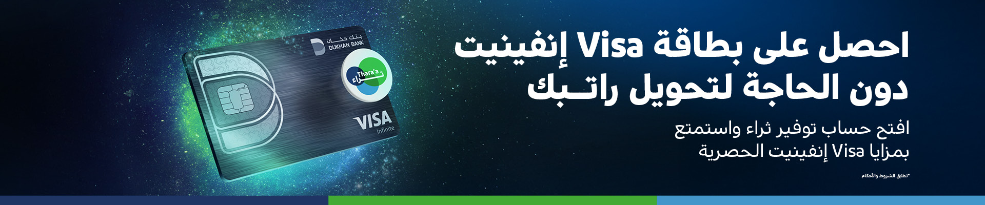 احصل على بطاقة Visa إنفينيت الائتمانية من بنك دخان دون الحاجة إلى تحويل راتبك. ما عليك سوى إيداع رصيد قدره 100,000 ر.ق والحفاظ عليه في حساب التوفير "ثراء" للاستفادة من: