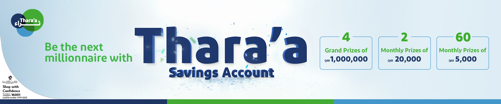 Enjoy greater chances to win monthly cash prizes and QAR 1,000,000 with Thara’a Savings Account.