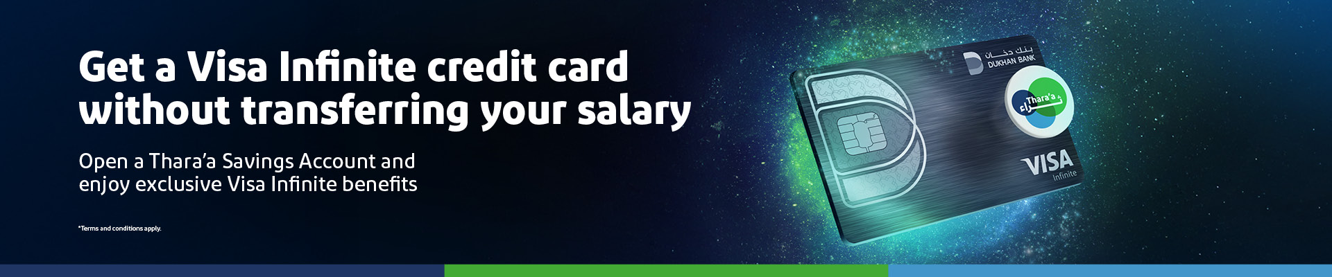 Get a Dukhan Bank Visa Infinite credit card without the need to transfer your salary. Simply deposit and maintain a balance of QAR 100,000 in your Thara’a Savings Account to enjoy: